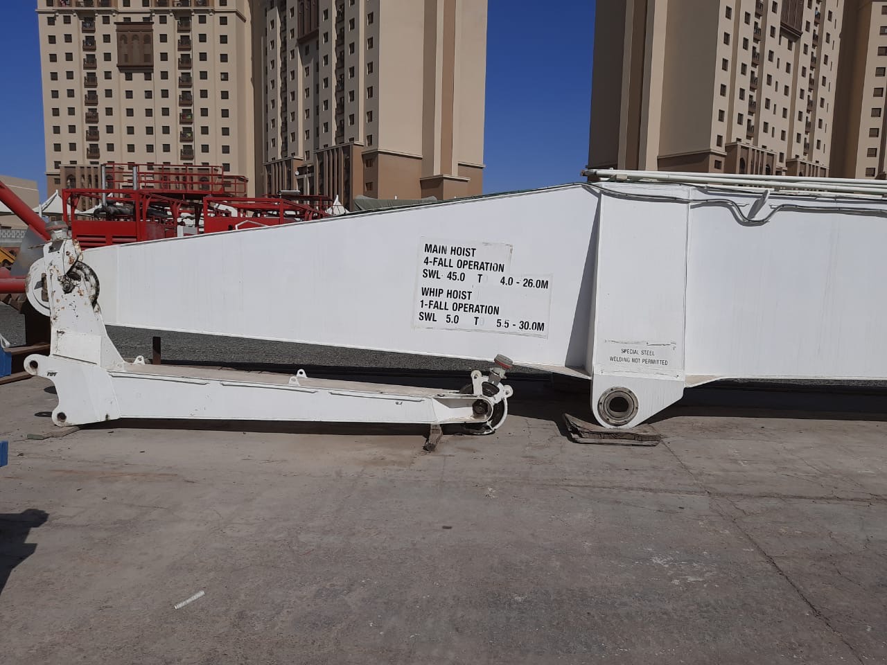 45 tons Liebherr deck crane for sale / 2003 MAKE: LIEBHERR MODEL: CBW S-45/26 + 5/30 YEAR OF MANUFACTURE: 2003 MAX. SWL MAIN HOIST: 45 TON CAPACITIES MAIN HOIST: 45 TON @ 4M – 26M MAX. HOOK TRAVEL MAIN HOIST: 56M MAX. SWL. AUX. HOIST: 5 TON CAPACITIES AUX. HOIST: 5 TON @ 5.5M – 30M MAX. HOOK TRAVEL AUX. HOIST: 60M MAX. ADMISSIBLE HEELING / TRIM: 5 DEGREES / 2 DEGREES AMBIENT WORKING TEMPERATURE: -25 DEGREES TO +50 DEGREES CELSIUS. CERTIFYING AUTHORITY: ABS – CERTIFICATE FOR SHIPBOARD CARGO CRANES SLEWING RANGE: 360 DEGREES UNLIMITED MAIN POWER SUPPLY: 440V / 60HZ / 3PH NOMINAL OUTPUT: 220 KW AUX. POWER SUPPLY: 220V / 60HZ / 3PH CRANE COMES WITH PEDESTAL PRICE ON REQUEST